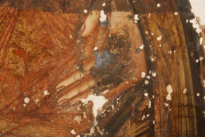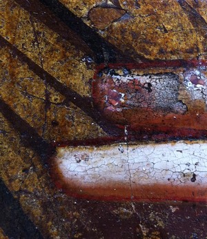 Рассматривая икону на рабочем столе, меня не покидает чувство о еще какой-то тайне, скрытой в создании самой иконы. Весь процесс реставрации происходит в общении со святым образом, в размышлении о стилистике письма, о времени, когда была создана святыня, о той сакральной сути самой иконы, к которой прикасается моя кисть при тонировках. Конечно, сакральную суть мне не понять, как бы я ни старался, это как вера – она есть или ее нет. Иногда просто в молчании смотришь на образ, забывая о времени: вот так бы и уйти в бесконечность вслед за образом по длинным лучам заходящего летнего солнца, которое освещает вечерним светом мою мастерскую. Размышления, предположения… Возможно резной левкас был создан позже, чем была написана сама икона? Как иконописец, зная о декоративном фоне иконы, для которого нужна была ровная поверхность, вдруг заказывает доску с ковчегом, который явно мешал в дальнейшем резчику по левкасу? Доска под икону была выполнена раньше, чем сам резной левкас – единственный ответ, который приходит на ум. Значит фон иконы со знаменитым «павлиньим глазом» был сделан позже, возможно под барочный иконостас храма, в который была внесена святыня. А как же сами лики? Не поновлялись ли они, когда икону украшали резным орнаментом?