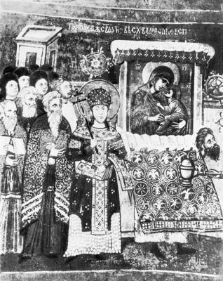 Текст акафиста Богородице, защитнице Константинополя, иллюстрировался также и в контексте традиции ее почитания в столице Византийской империи, воспоминаний многочисленных осад Влахернского квартала и служения акафиста Богородице во Влахернском храме с литией. В таких иллюстрациях изображалась сама служба акафиста Богородице с литией или поклонением иконе Божией Матери, что отражало реальные константинопольские процессии с иконами Богоматери.