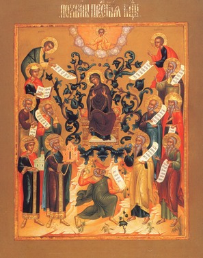 Создание акафиста Пресвятой Богородице оказало влияние на церковную иконографию. Так, стали появляться иконы Похвалы Богоматери, главной темой которых является прославление Божией Матери, ставшей, согласно ветхозаветным пророчествам, Матерью воплотившегося Бога. В основу иконографии положены слова песни канона пророкам, составленного в VIII веке Константинопольским Патриархом Германом: «Свыше пророцы Тя предвозвестиша, Отроковице: стамну, жезл, скрижаль, кивот, свещник, трапезу, гору несекомую, златую кадильницу и скинию, дверь непроходимую, палату, и лествицу, и престол Царев». На основе этой песни на иконах изображают следующих ветхозаветных пророков, держащих в руках определенные предметы, послужившие прообразом Матери Божией: Иакова с лестницей, Моисея с Неопалимой Купиной, Валаама со звездой, Гедеона с руном, Иезекииля с вратами, Иеремию со скрижалью, Исаию с клещами и углем, Иессея и Аарона с процветшими жезлами, Давида и Соломона с макетами Иерусалимского Храма, Даниила и Аввакума с горами.