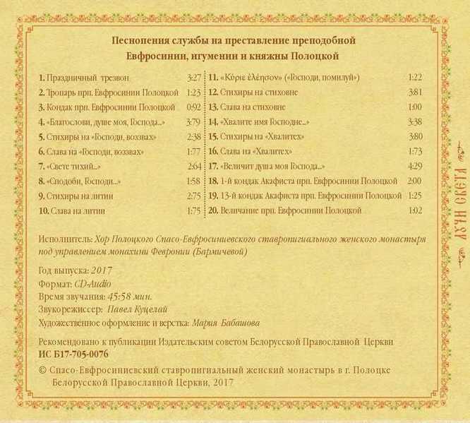 «Неувядающий цвет райского сада» Песнопения службы на преставление преподобной Евфросинии, игумении и княжны Полоцкой