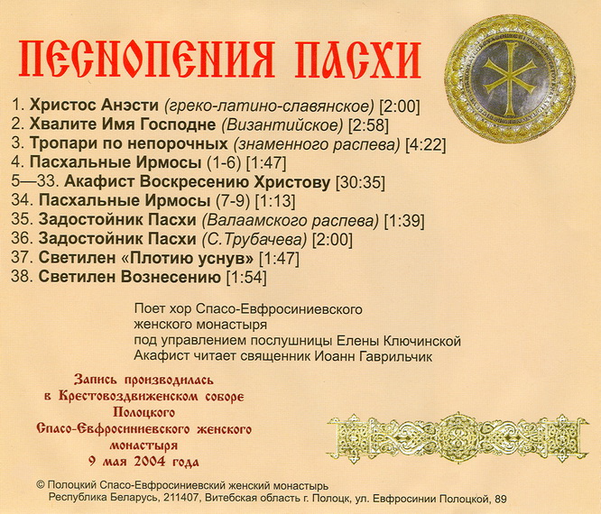 Запись произведена в Кресто-Воздвиженском соборе монастыря 9 мая 2004 года.