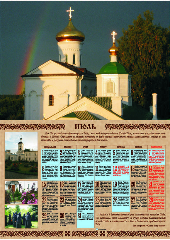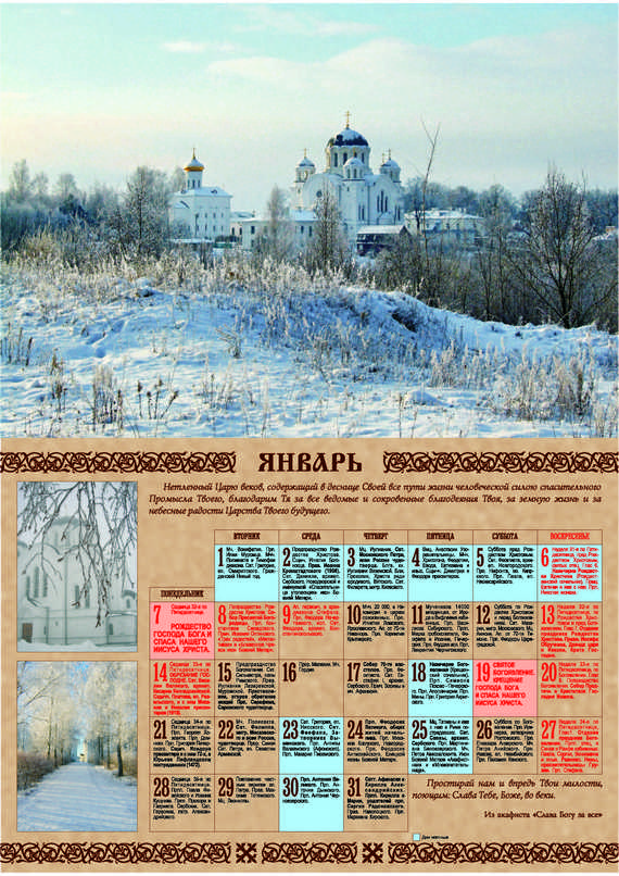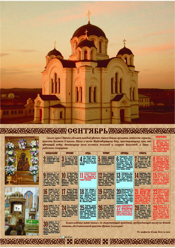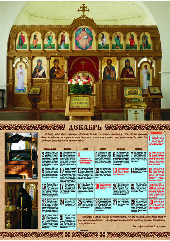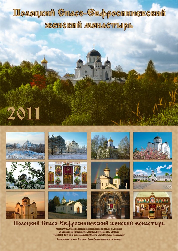 Церковный календарь на 2011 год с фотографиями Спасо-Евфросиниевского монастыря и цитатами из акафиста «Слава Богу за все!»Место издания: Полоцк Год издания: 2010 Примеры страниц: