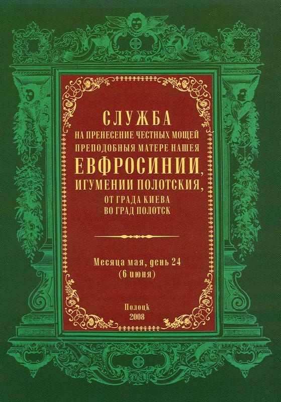 Служба на пренесение честных мощей преподобныя матере нашея Евфросинии, игумении Полотския от града Киева во град Полотск. Месяца мая, день 24 (6 июня)Место издания: Полоцк Год издания: 2008